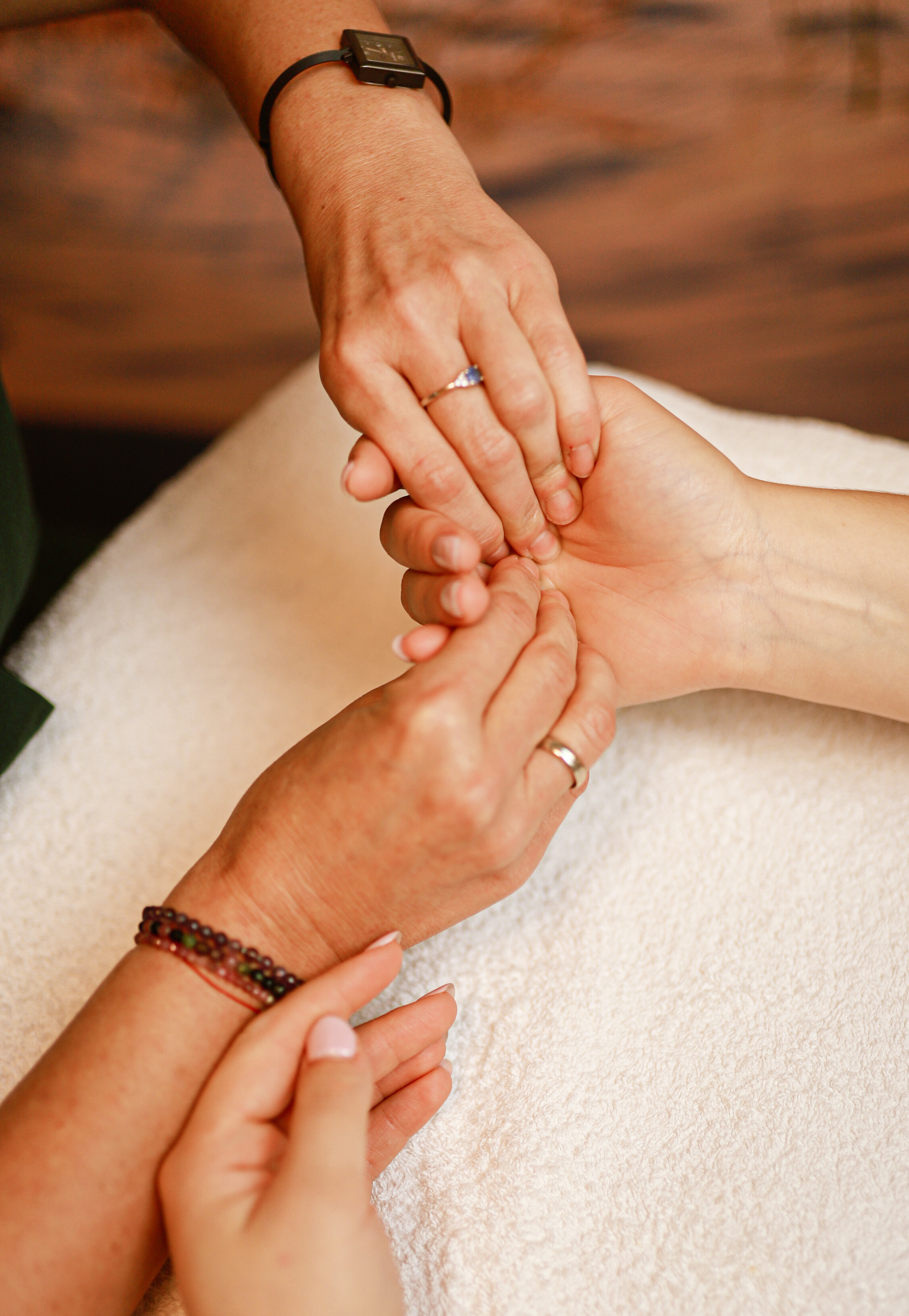 Dłonie, jako bardziej dostępne, mogą być uzupełnieniem pracy na stopach. Refleksologię rąk wykonujemy w celach rozluźniających i relaksacyjnych (sięgając aż do obręczy barkowej) lub kiedy stopy są niedostępne (np. przez kontuzje).